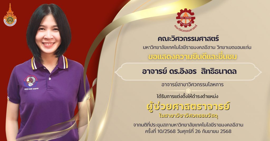 ผู้ช่วยศาสตราจารย์ ในสาขาวิชาวิศวกรรมวัสดุจากมติที่ประชุมสภามหาวิทยาลัยเทคโนโลยีราชมงคลอีสานครั้งที่ 10/2568 วันศุกร์ที่ 26 กันยายน 2568