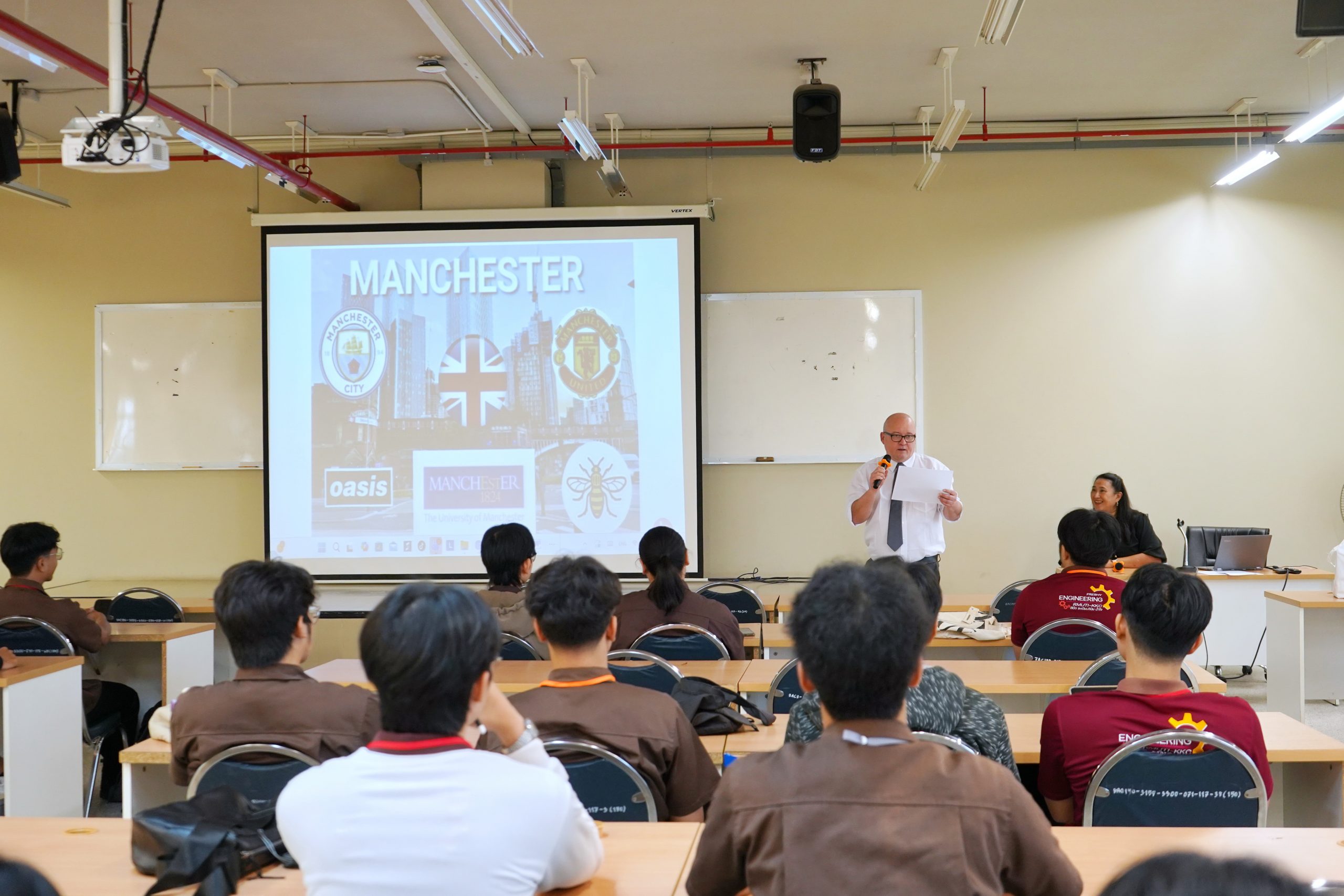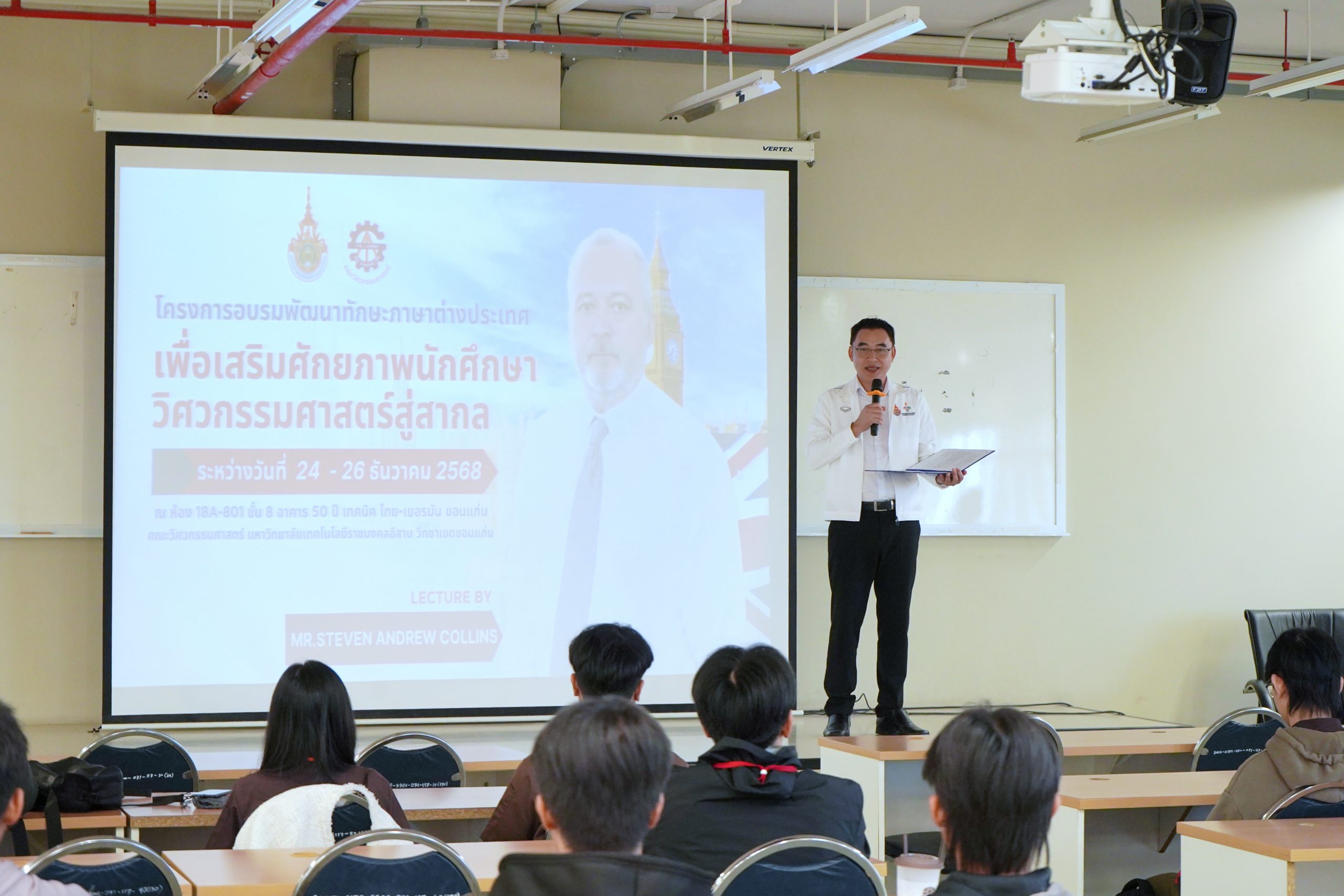24 ธ.ค.68: คณะวิศวกรรมศาสตร์ มหาวิทยาลัยเทคโนโลยีราชมงคลอีสาน วิทยาเขตขอนแก่น จัดโครงการอบรมพัฒนาทักษะภาษาต่างประเทศ เพื่อเสริมศักยภาพนักศึกษาวิศวกรรมศาสตร์สู่สากล ระหว่างวันที่ 24 ธ.ค.68– 30 ม.ค.69 ณ ห้อง 18A-801 อาคาร 50 ปี เทคนิคไทย-เยอรมัน ขอนแก่น โดย ผศ.ดร.ศุภฤกษ์ ชามงคลประดิษฐ์ คณบดี เป็นประธานกล่าวเปิดโครงการและกล่าวต้อนรับวิทยากรและนักศึกษาที่เข้าร่วมอบรม พร้อมด้วย รศ.ดร.วิเชียร แสงอรุณ กล่าวรายงาน ซึ่งได้รับเกียรติจาก Mr.Steve Colin เป็นวิทยากร วัตถุประสงค์ เพื่อพัฒนาทักษะการสื่อสารภาษาอังกฤษ ในบริบทธรรมชาติและวิศวกรรม เสริมความมั่นใจในการพูด ฟัง และโต้ตอบผ่านเกมและกิจกรรมจำลองสถานการณ์จริง และ เตรียมความพร้อมสู่การทำงานในระดับสากล