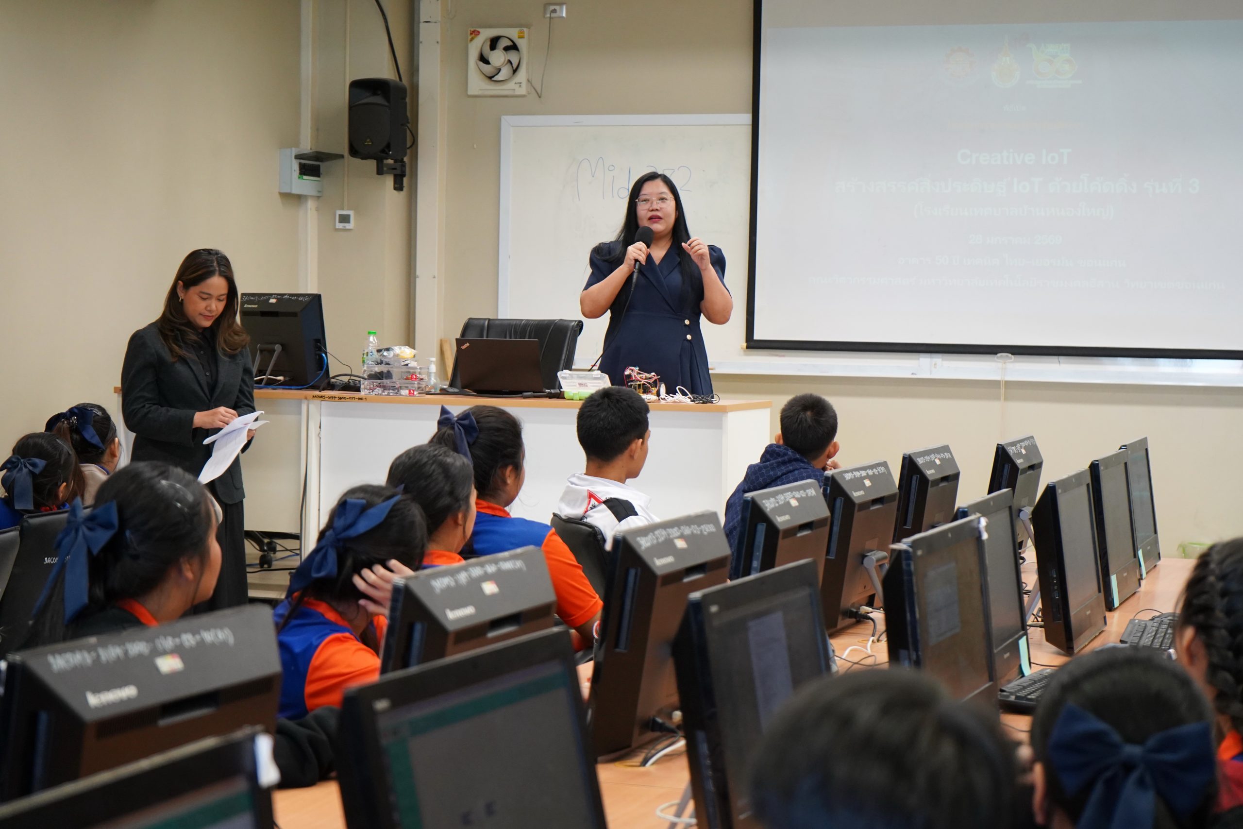 28 ม.ค.69: สาขาวิศวกรรมคอมพิวเตอร์ คณะวิศวกรรมศาสตร์ มหาวิทยาลัยเทคโนโลยีราชมงคลอีสาน วิทยาเขตขอนแก่น จัดโครงการบริการวิชาการ การอบรมเชิงปฏิบัติการ Creative IoT: สร้างสรรค์สิ่งประดิษฐ์ IoT โค้ดดิ้ง แก่นักเรียน โรงเรียนเทศบาลบ้านหนองใหญ่ โดย อาจารย์ ดร.ปิยะนุช ตั้งกิตติพล หัวหน้าสาขา กล่าวเปิดโครงการและกล่าวต้อนรับ คณาจารย์และนักเรียนโรงเรียนเทศบาลบ้านหนองใหญ่ พร้อมด้วยคณาจารย์ และนักศึกษาสาขาวิศวกรรมคอมพิวเตอร์เข้าร่วมโครงการฯ ณ ห้อง ปฏิบัติการคอมพิวเตอร์ ชั้น 3 อาคาร 50 ปี เทคนิค ไทย – เยอรมัน ขอนแก่น