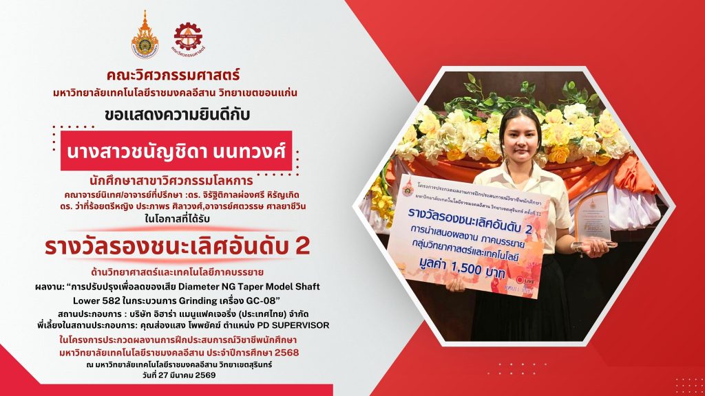 นางสาวชนัญชิดา นนทวงศ์นักศึกษาสาขาวิชาวิศวกรรมโลหการ คณาจารย์นิเทศ/อาจารย์ที่ปรึกษา :1. อาจารย์ ดร. จิรัฐิติกาลผ่องศรี หิรัญเกิด 2. อาจารย์ ดร. ว่าที่ร้อยตรีหญิง ประภาพร ศิลาวงศ์ 3. อาจารย์ศตวรรษ ศาลยาชีวินผลงานเรื่อง “การปรับปรุงเพื่อลดของเสีย Diameter NG Taper Model Shaft Lower 582 ในกระบวนการ Grinding เครื่อง GC-08”สถานประกอบการ : บริษัท อิฮาร่า แมนูแฟคเจอริ่ง (ประเทศไทย) จำกัดพี่เลี้ยงในสถานประกอบการ : คุณส่องแสง โพพยัคฆ์ ตำแหน่ง PD Supervisor