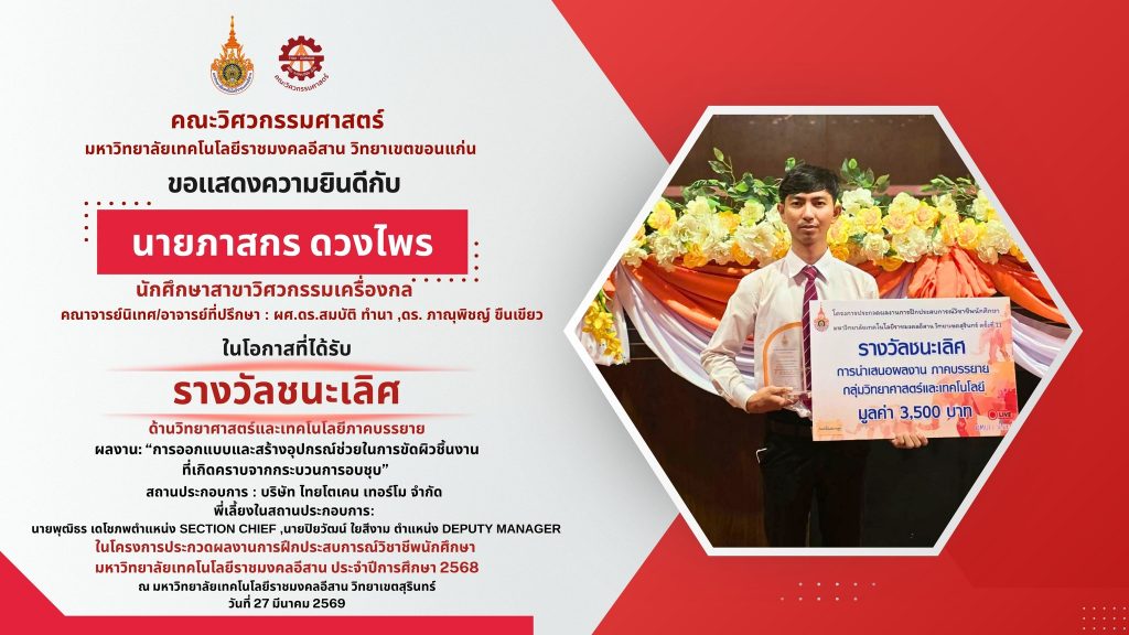 นายภาสกร ดวงไพรนักศึกษาสาขาวิชาวิศวกรรมเครื่องกลคณาจารย์นิเทศ/อาจารย์ที่ปรึกษา : ผู้ช่วยศาสตราจารย์ ดร. สมบัติ ทำนา อาจารย์ ดร. ภาณุพิชญ์ ขืนเขียวผลงานเรื่อง “การออกแบบและสร้างอุปกรณ์ช่วยในการขัดผิวชิ้นงานที่เกิดคราบจากกระบวนการอบชุบ”สถานประกอบการ : บริษัท ไทยโตเคน เทอร์โม จำกัด พี่เลี้ยงในสถานประกอบการ : 1. นายพุฒิธร เดโชภพ ตำแหน่ง Section Chief 2. นายปิยวัฒน์ ใยสีงาม ตำแหน่ง Deputy Manager