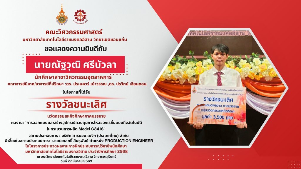นายณัฐวุฒิ ศรีบัวลานักศึกษาสาขาวิชาวิศวกรรมอุตสาหการ คณาจารย์นิเทศ/อาจารย์ที่ปรึกษา : 1. อาจารย์ ดร. ปรเมศวร์ เบ้าวรรณ 2. อาจารย์ ดร. ปรวิทย์ เจียนดอนผลงานเรื่อง “การออกแบบและสร้างอุปกรณ์ควบคุมการไหลของเรซิ่นแบบกึ่งอัตโนมัติในกระบวนการผลิต Model C3416” สถานประกอบการ : บริษัท คาร์บอน เมจิก (ประเทศไทย) จำกัด พี่เลี้ยงในสถานประกอบการ : นายเอกสทธิ์ สินธุพันธ์ ตำแหน่ง Production Engineer
