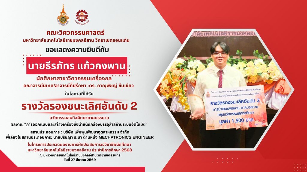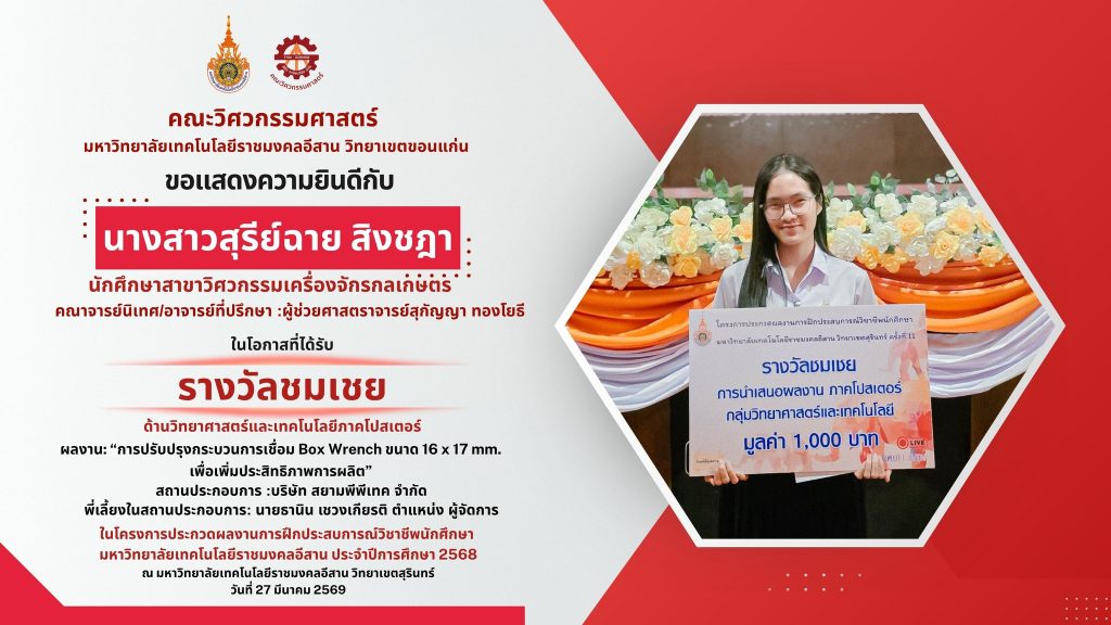 ขอแสดงความยินดีกับ นักศึกษาและคณาจารย์นิเทศ/อาจารย์ที่ปรึกษาในโอกาสที่ได้รับรางวัลจากโครงการประกวดผลงานการฝึกประสบการณ์วิชาชีพนักศึกษา มหาวิทยาลัยเทคโนโลยีราชมงคลอีสาน ประจำปีการศึกษา 2568ณ มหาวิทยาลัยเทคโนโลยีราชมงคลอีสาน วิทยาเขตสุรินทร์วันที่ 27 มีนาคม 2569