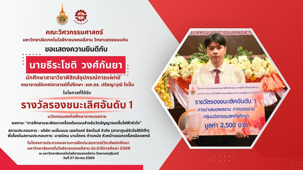 นายธีระโชติ วงศ์กันยานักศึกษาสาขาวิชาฟิสิกส์อุปกรณ์การแพทย์ คณะวิศวกรรมศาสตร์คณาจารย์นิเทศ/อาจารย์ที่ปรึกษา : ผู้ช่วยศาสตราจารย์ ดร. ปรัชญาวุฒิ โถปั้น ผลงานเรื่อง “การศึกษาและพัฒนาเครื่องต้นแบบสำหรับวัดสัญญาณคลื่นไฟฟ้าหัวใจ” สถานประกอบการ : บริษัท เนชั่นแนล เฮลท์แคร์ ซิสเท็มส์ จำกัด (สาขาศูนย์หัวใจสิริกิติ์ฯ) พี่เลี้ยงในสถานประกอบการ : นายนิคม นามโคตร ตำแหน่ง หัวหน้าแผนกเครื่องมือแพทย์