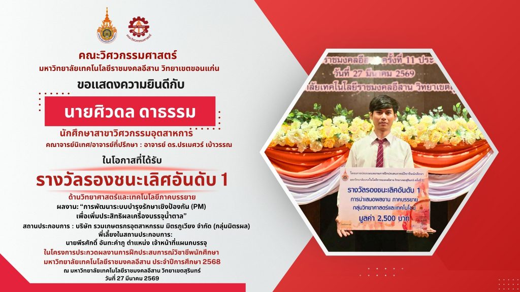 นายศิวดล ดาธรรมนักศึกษาสาขาวิชาวิศวกรรมอุตสาหการ คณาจารย์นิเทศ/อาจารย์ที่ปรึกษา : อาจารย์ ดร.ปรเมศวร์ เบ้าวรรณผลงานเรื่อง “การพัฒนาระบบบำรุงรักษาเชิงป้องกัน (PM) เพื่อเพิ่มประสิทธิผลเครื่องบรรจุน้ำตาล”สถานประกอบการ : บริษัท รวมเกษตรกรอุตสาหกรรม มิตรภูเวียง จำกัด (กลุ่มมิตรผล)พี่เลี้ยงในสถานประกอบการ : นายพีรศักดิ์ อันทะคำภู ตำแหน่ง เจ้าหน้าที่แผนกบรรจุ