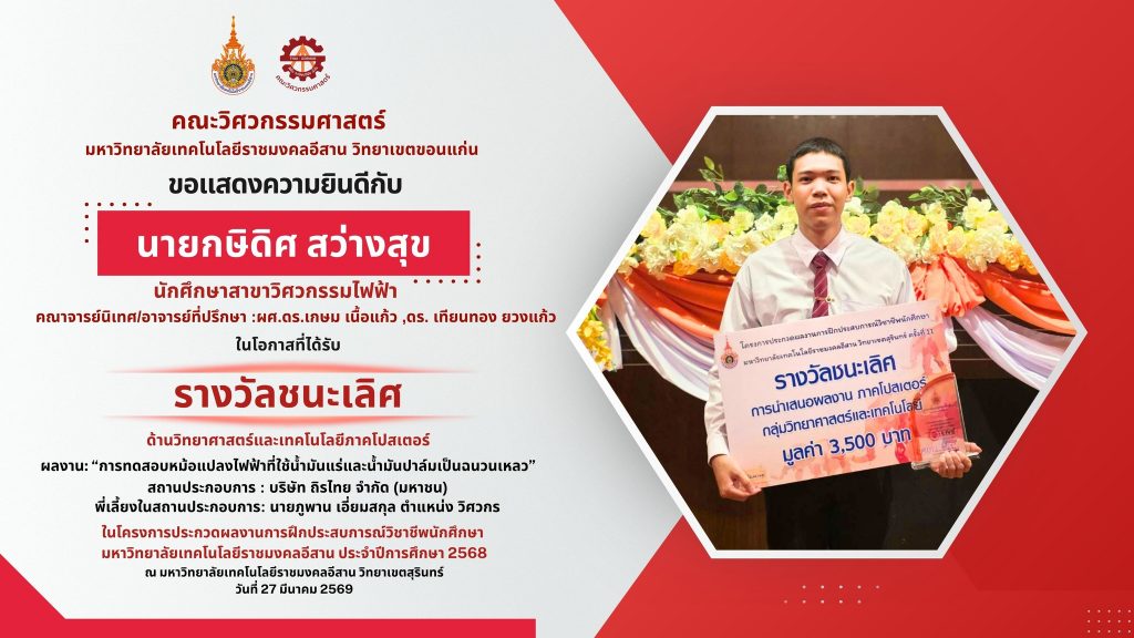 นายกษิดิศ สว่างสุขนักศึกษาสาขาวิชาวิศวกรรมไฟฟ้า คณาจารย์นิเทศ/อาจารย์ที่ปรึกษา : 1. ผู้ช่วยศาสตราจารย์ ดร.เกษม เนื้อแก้ว 2. อาจารย์ ดร. เทียนทอง ยวงแก้วผลงานเรื่อง “การทดสอบหม้อแปลงไฟฟ้าที่ใช้น้ำมันแร่และน้ำมันปาล์มเป็นฉนวนเหลว”สถานประกอบการ : บริษัท ถิรไทย จำกัด (มหาชน)พี่เลี้ยงในสถานประกอบการ : นายภูพาน เอี่ยมสกุล ตำแหน่ง วิศวกร